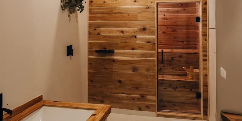 A custom-built redwood stone sauna (not infrared) that heats up to 195°F for full-body immersion and detox